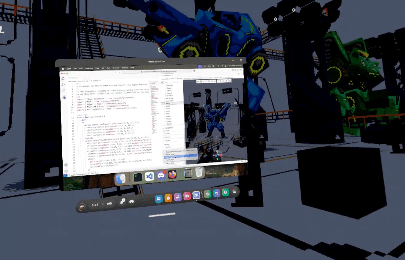 WebXR is a pretty dope piece of tech and React Three Fiber has great support for it thanks to the XR package — loads of people use it to create immersive experiences for the browser. Triplex now supports opening 3D components in WebXR so you can view, interact, and transform 3D components in your headset.